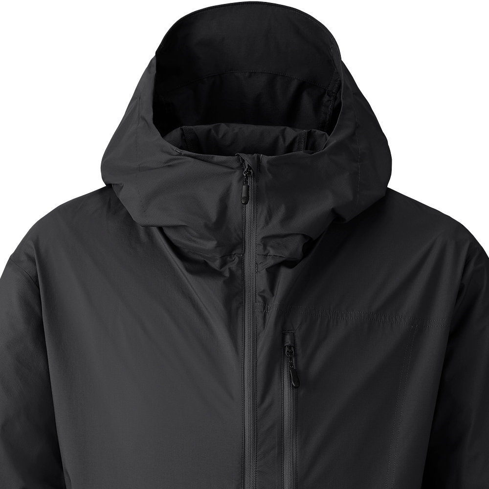 オリジナルのワンハンドフードアジャストシステムにより暴風時でもフィッティング性を高め、フード先端のツバが垂れてこないように設計。